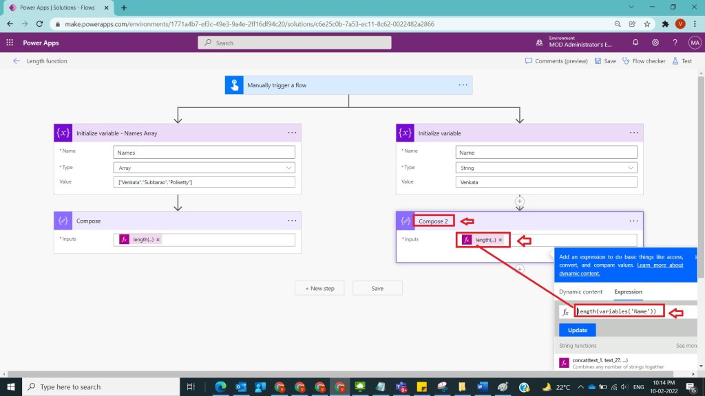 After Step 4, under Initialize variable – Names Array take compose action and provide length function which Returns Returns the number of elements in an array or string and use length function as