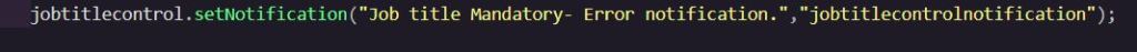 jobtitlecontrol.setNotification(“Job title Mandatory- Error notification.”,”jobtitlecontrolnotification”);
