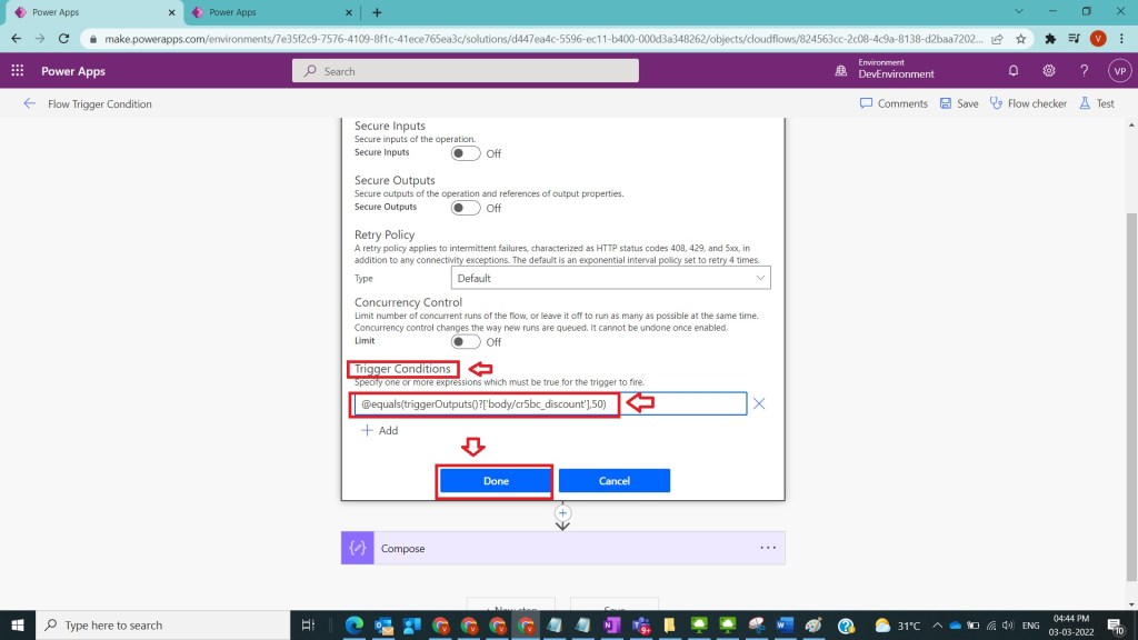 Inputs : Discount is 50 % ? @{equals(triggerOutputs()?[‘body/cr5bc_discount’],50)} , send alert regarding offers