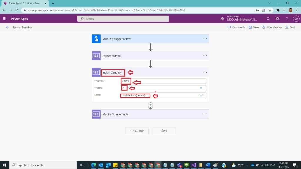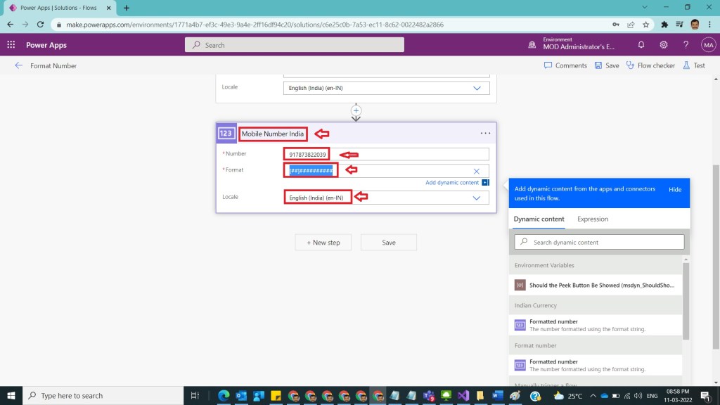 After Step 5, to show number in Indian mobile number format take another Format number action and name it as Mobile Number India and provide the values as inputs
