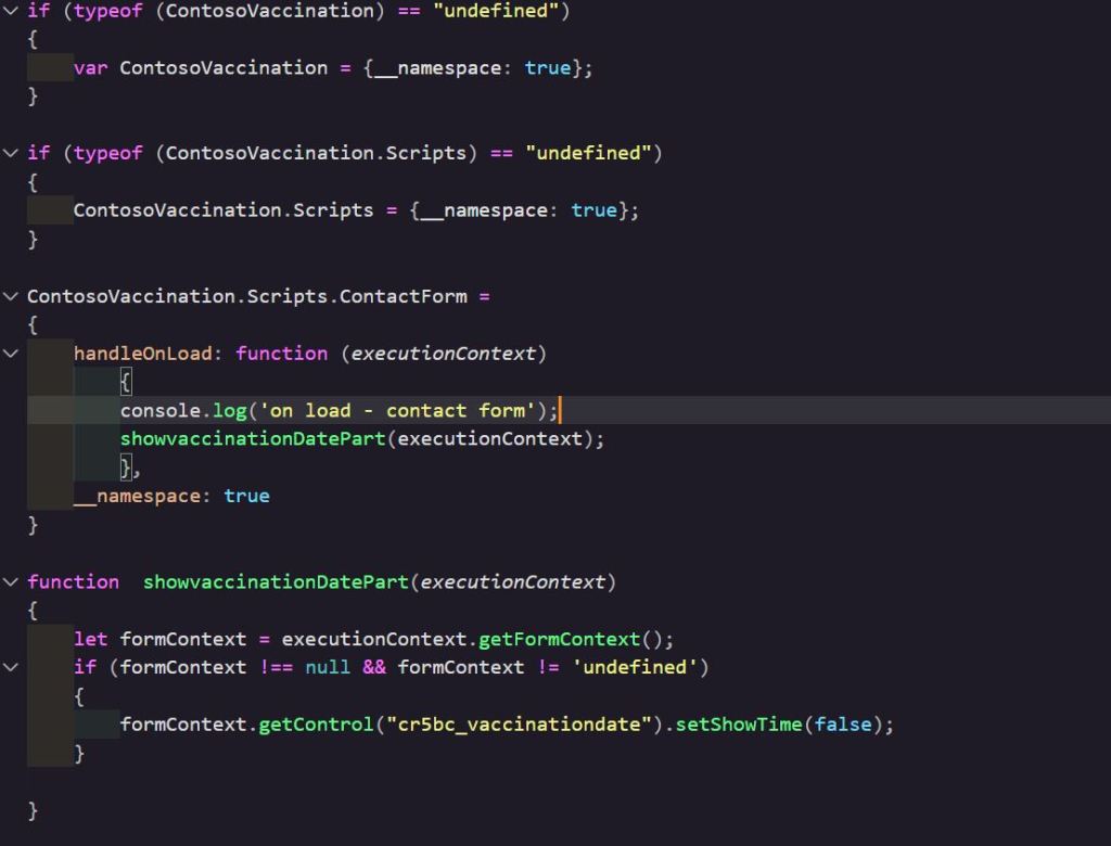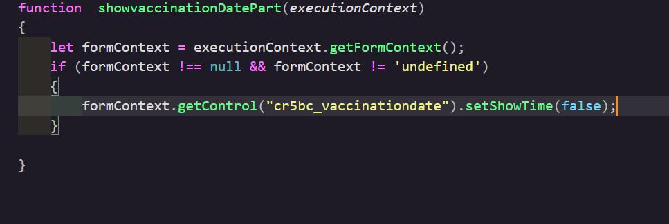 In Dynamics 365 CRM, at times we must show only date part for a field of date time type if at all customers were not in favour of creating same field with date Only format. Then this can be achieved by the usage of setShowTime Client API reference, which specify whether a date control should show the time portion of the date or not. As an example, Vaccination date is used to explain this functionality.