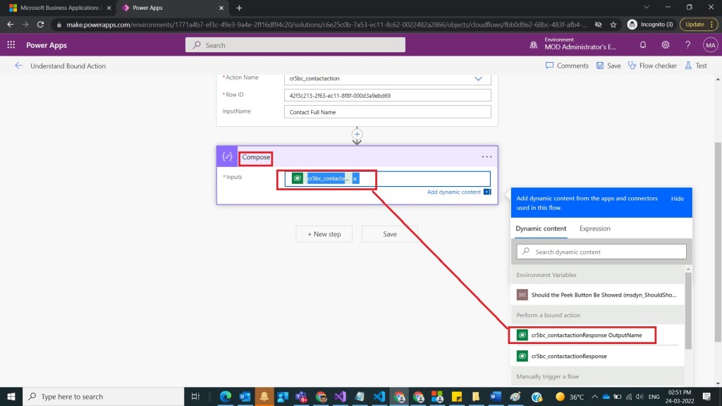 Inputs : @{outputs(‘Perform_an_unbound_action’)?[‘body/OutputArgument’]}
