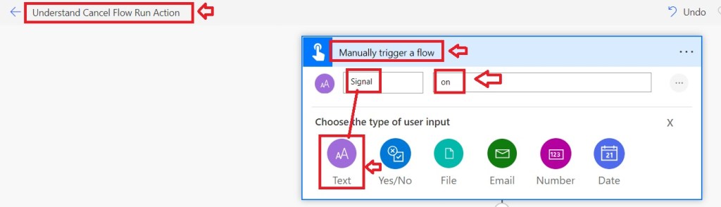 After Step 2 , name the flow as Understand Cancel Flow Run Action and Manually trigger provide input values of by selecting type of user input as text as