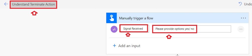 After Step 2 , name the flow as Understand Terminate Action and Manually trigger provide input values of by selecting type of user input as text as