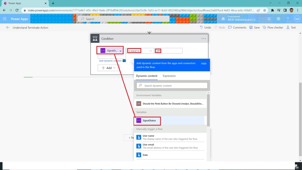 After Step 8, now save and test the flow and provide the value as no you should see the see the no part of the condition Terminate action will get executed and terminates flow as shown in the below figure.