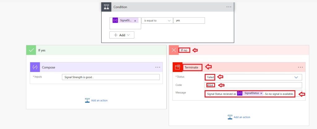 Message : Signal Status recieved as @{variables(‘SignalStatus’)}. So no signal is available.