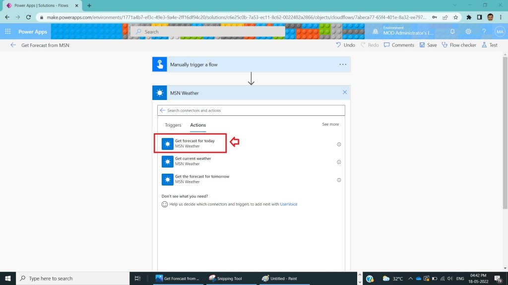 After Step 2 , name the flow as Get Forecast from MSN and after Manually trigger action under choose an operation select MSN Weather Connector