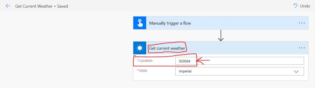 - Under Location parameter in Get Current Weather action valid inputs are City,Region,State,Country,Landmark,Postal Code,Latitude and Longitude.