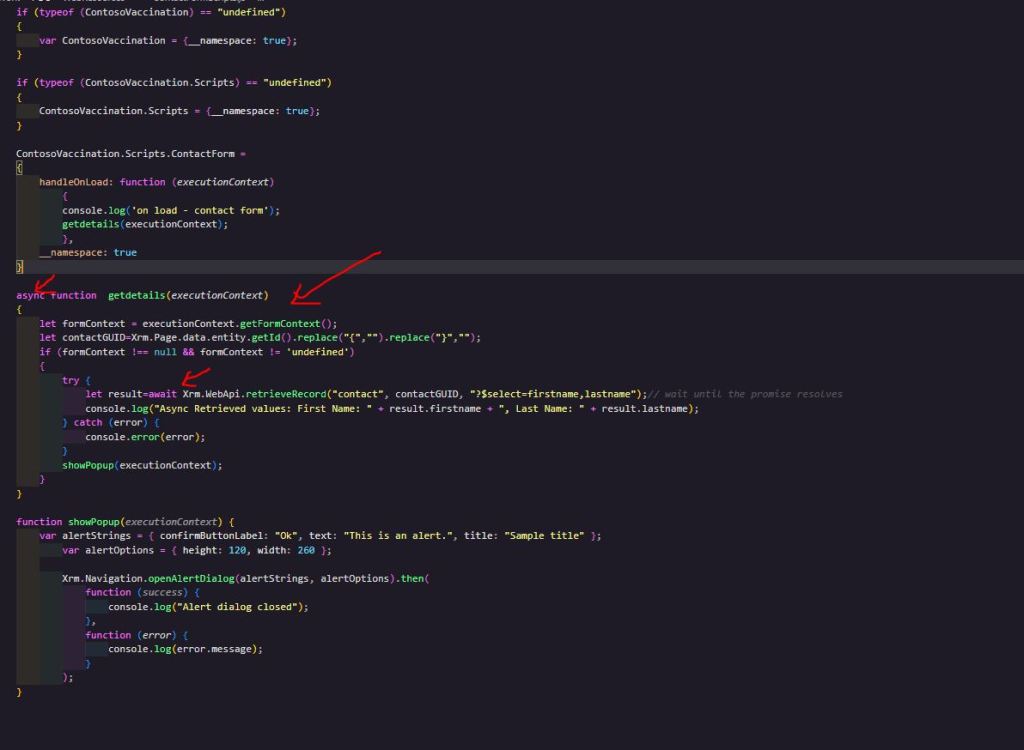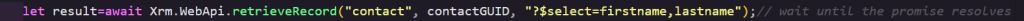 let result=await Xrm.WebApi.retrieveRecord(“contact”, contactGUID, “?$select=firstname,lastname”);// wait until the promise resolves