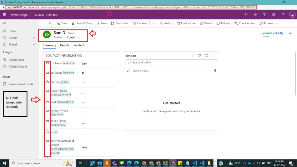After Step 6, save function and update Webresource with this file and publish it on the contact form and open any contact and observe all fields as readonly as shown in the below figure