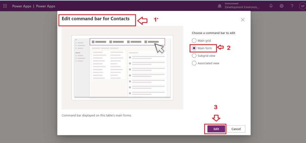 Open any model driven app as an example I have added contact form in my model driven app (Contacts Information App) and click on Contact table in the left side of the model driven app and select Edit Command Bar option as shown in the figure.