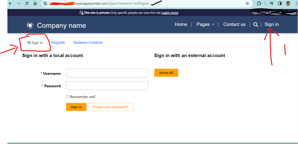 Step 1 : Once you create a site as mentioned in previous blog post . Any user click on sign in button present in the home page screen looks like below and highlighted part of Sign in area in tab control represents local login.