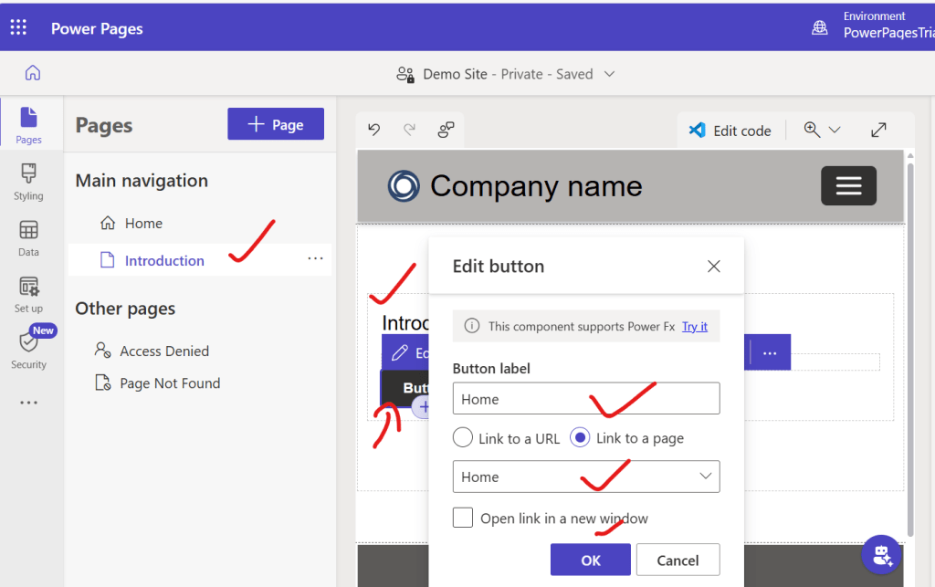 Now from components section select text field and a button field and some text and url of the existing home page can be given and click on ok as shown below