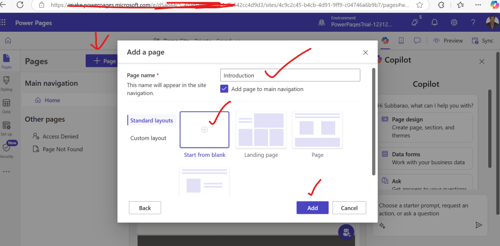 After creation of new website in design studio , click on + Page . A popup with Add a page title will occur and provide a name and select Standard layout and select Start from blank template and click on add as shown below
