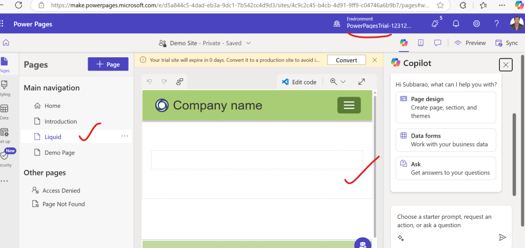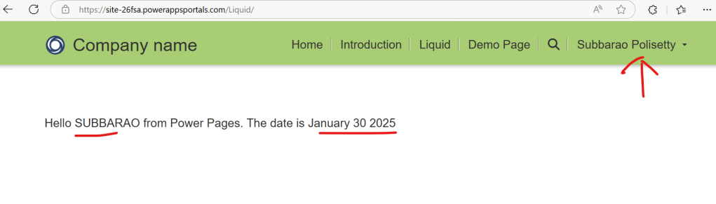In most of the applications it is a common thing to show logged in user name on the top of the page somewhere at corner right . In Traditional Microsoft’s ASP.NET we use GetUserId() method present under Identity libraries present in Microsoft . Then how can we achieve similar functionality where we can write some code dynamically to achieve the same result to get user details. There comes Liquid an open-source template language integrated into power pages where we can perform