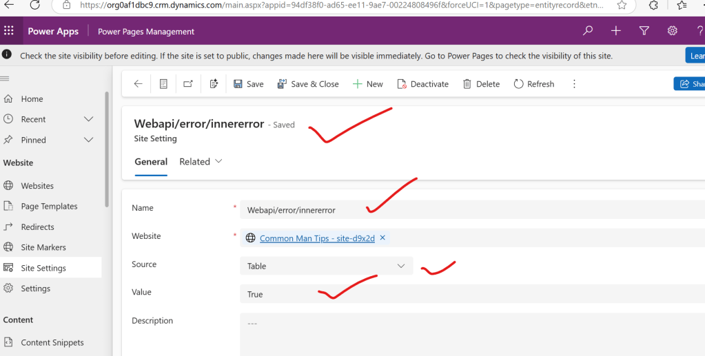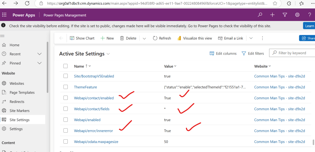a. Create a site setting with the following convention Webapi/<<data verse table name>>/enabled as shown below