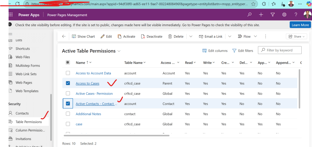 Step 2: For the 2 tables contact and incident (case) create respective table permissions for contact and case tables as shown below
